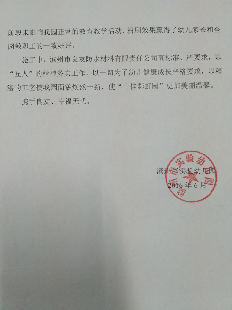 近日,滨州市实验幼儿园对良友防水公司做出了书面评价。